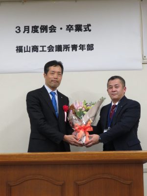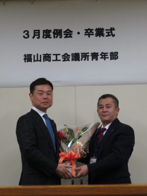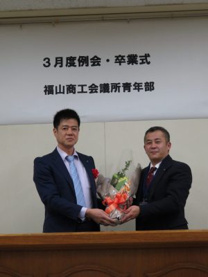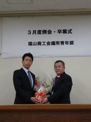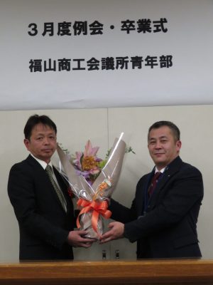3月6日 3月度例会・卒業式が行われました。 大田 祐介先輩、坂本 修二郎先輩、佐藤 幸光先輩 中島 基晴先輩、延平典嗣先輩、濱畑進先輩 牧平 学先輩、三島 英揮先輩、門出研一先輩 ご卒業おめでとうございます。 長きにわたり福山YEGを支えていただきありがとうございました。